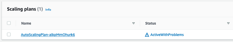 Scaling plan has been updated but failed to be applied to all resources. Problems were encountered for 1 resource. See scaling plan resources for the failure details.And subsequently maybe also the following in the AWS AutoScaling console:
